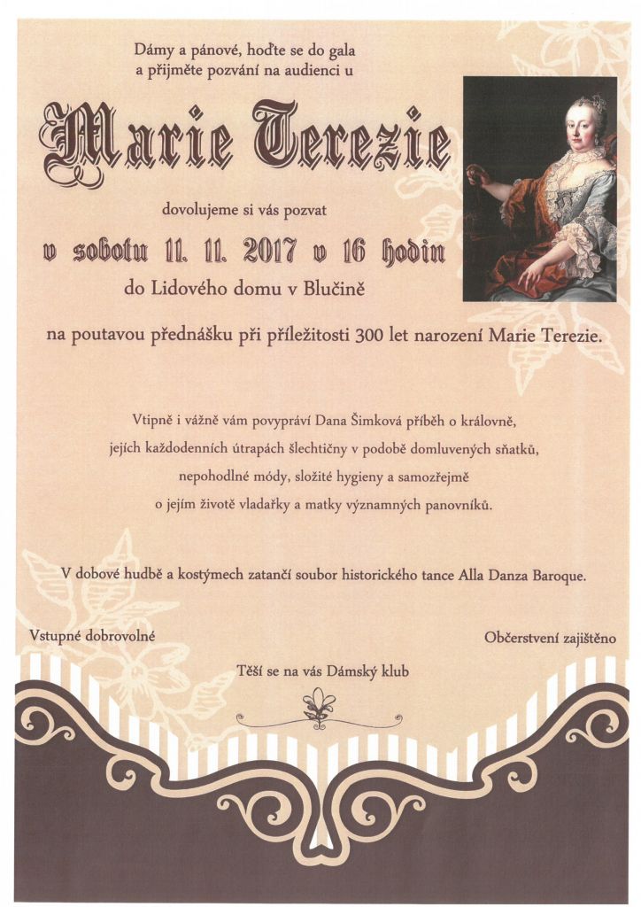 Dovolujeme si vás pozvat na poutavou přednášku při příležitosti 300 let narození Marie Terezie v sobotu 11.11.2017 v 16 hodin do Lidového domu v Blučině- MARIE TEREZIE.