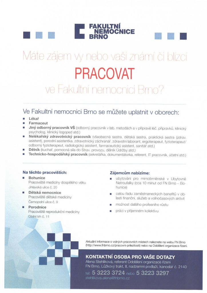 Fakultní nemocnice Brno, jakožto druhý největší poskytovatel zdravotních služeb v České republice, nabízí pracovní uplatnění pro zájemce ve všech oborech, a to nejen zdravotnických. V současné době nabízí volná pracovní místa pro technicko- hospodářské pracovníky (zejména pracovníky IT, účetní, referenty) i dělnické profese (kuchaře a pomocné síly do Stravovacího provozu, dělníky do Údržby, dělníky na Centrální sterilizaci atd.). Zaměstnanci mohou čerpat celou řadu velice zajímavých a finančně výhodných benefitů. Pro mimobrněnské zájemce mohou zprostředkovat ubytování v ubytovně. Kontaktní osoba pro vaše dotazy- paní Alena Stehlíková, referent Oddělení organizace řízení FN Brno, tel. 532 233 724 nebo 532 233 297, e- mail: stehlikova.alena@fnbrno.cz.