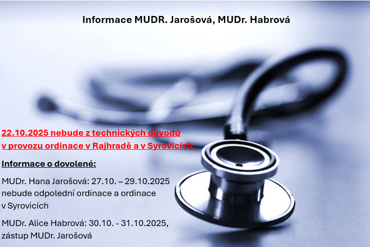 MUDr. Jarošová 27.10.-29.10.(není odpolední ordinace a ordinace v Syrovicích