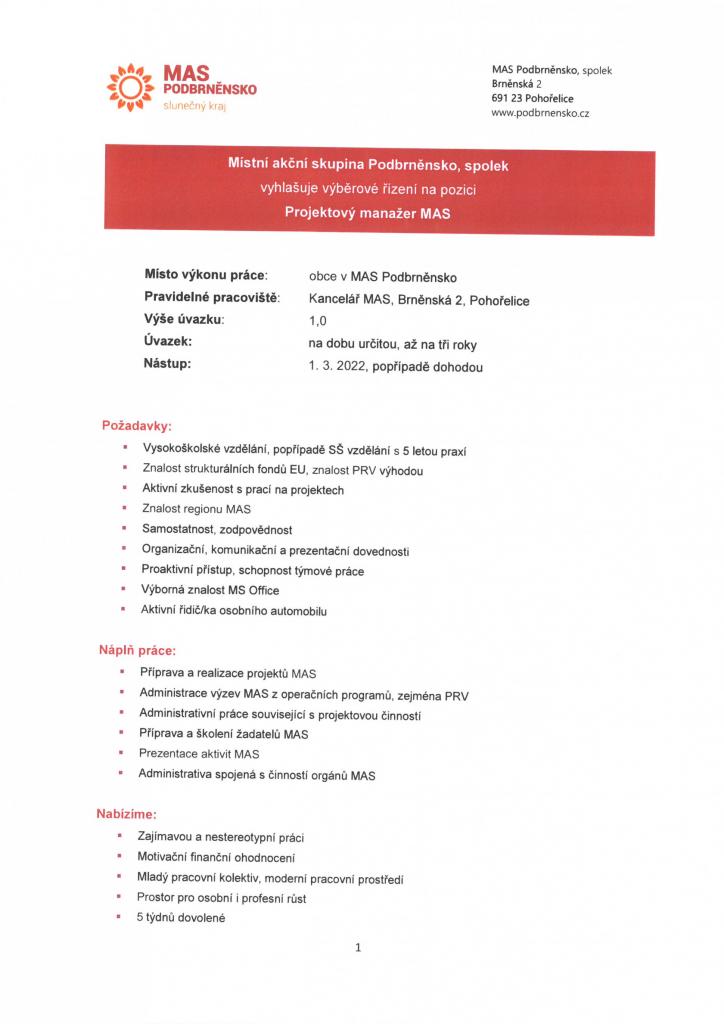 MAS vyhlašuje výběrové řízení na pozici Projektový manažer MAS. Termín nástupu : 1.3.2022 na dobu určitou, minimálně 3 roky. Termín pro zaslání přihlášky do VŘ je 11.2.2022.