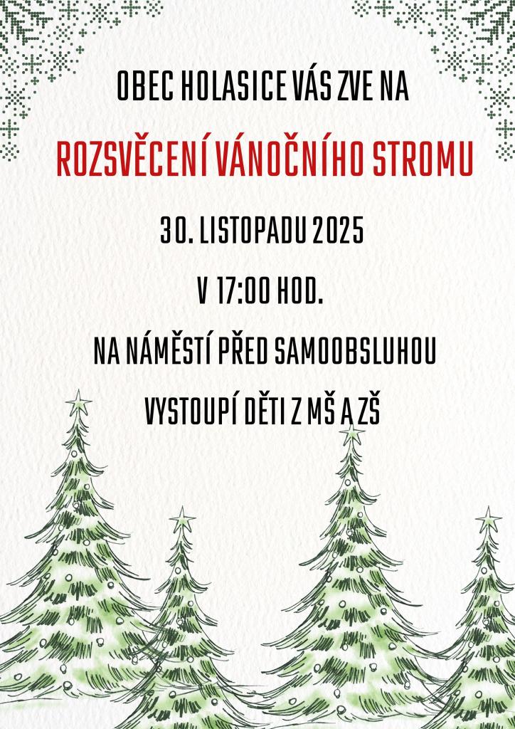 Obec Holasice Vás zve na rozsvěcení vánočního stromu 30. listopadu 2025 v 17:00 na náměstí před samoobsluhou, kde vystoupí děti z MŠ a ZŠ.