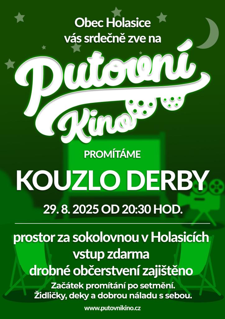 Obec Holasice Vás srdečně zve na Putovní kino. Promítáme film Kouzlo derby 29.8.2025 od 20:30 hod za sokolovnou. Vstup zdarma, drobné občerstvení zajištěno. Židličky, deky a dobrou náladu s sebou :)