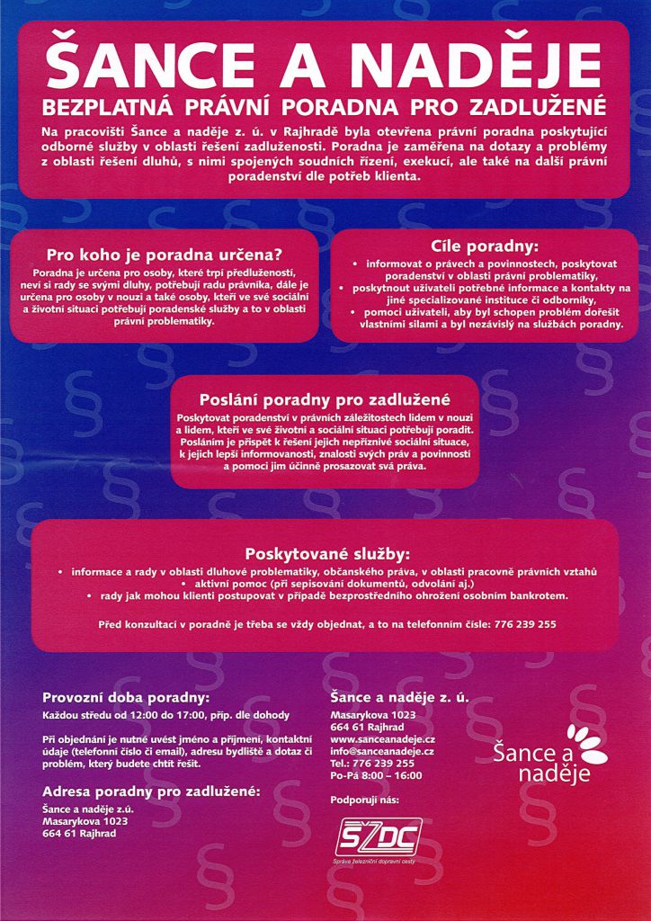 ŠANCE a NADĚJE- bezplatná právní poradna pro zadlužené v Rajhradě.