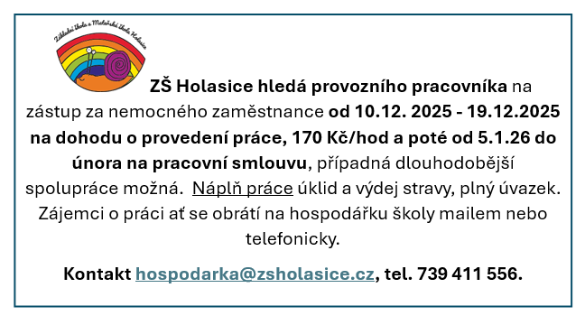 od 10.12.2025 - 19.12.na dohodu o provedení práce a poté od 5.1.2026 do února na pracovní smlouvu. Více informací na emailu hospodarka@zsholasice.cz, tel.: 739 411 556.